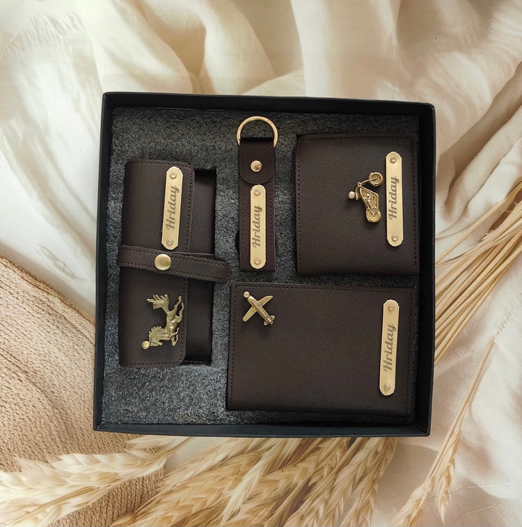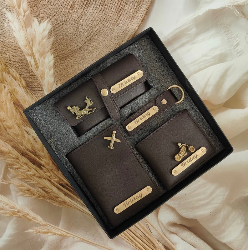 Customized Gift set for Men, includes Imported Leather wallet, Eyewear, Passport Cover & Keychain. All these are customized with one name tag and one charm respectively, which you can chose from the above list. Best for gifting on special occasions like birthday, anniversary or valentine gift for Men’s.