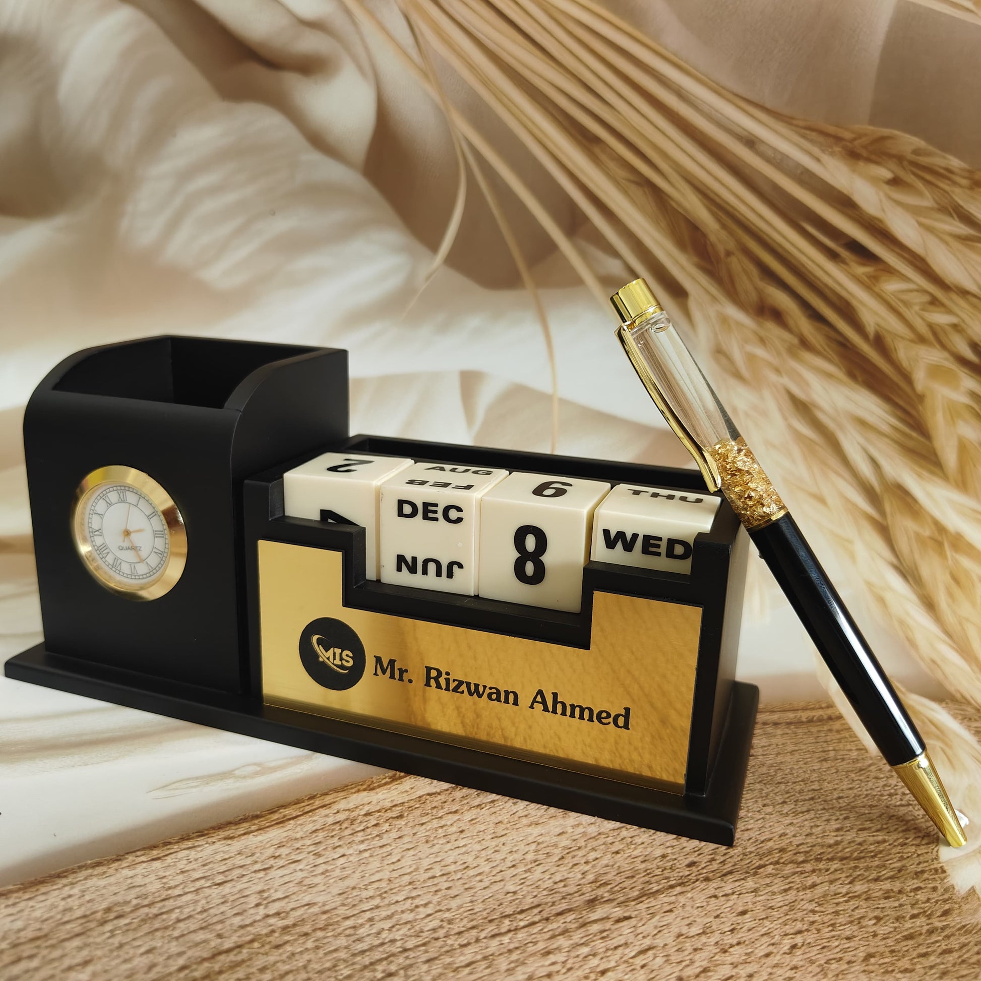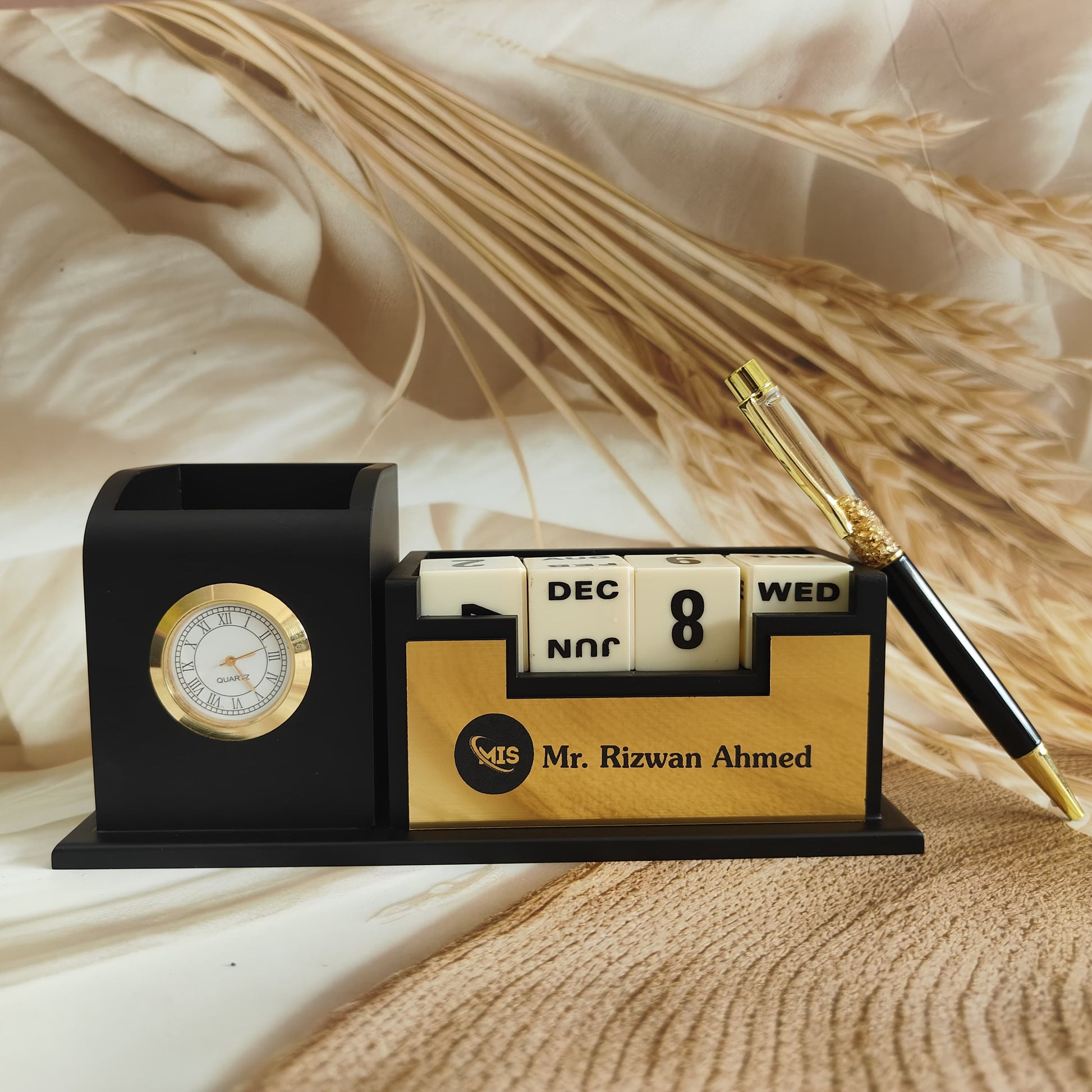 Personalise Pen Stand For Office Table, Desk Organizer With Customise Pen,Wooden Calendar, Pen Stand, Mobile Holder For Home And Office - Customized, Personalized Gift for Teachers, Doctors, CA, Employees