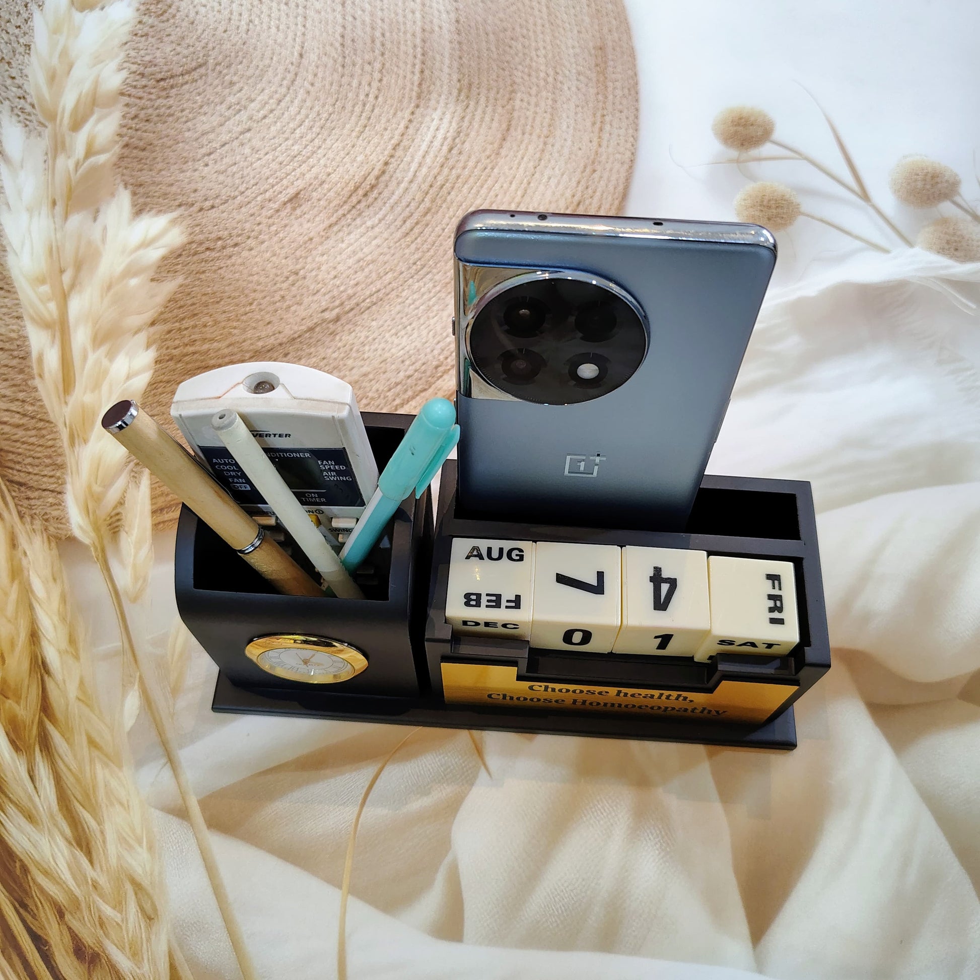 Personalise Pen Stand For Office Table, Desk Organizer With Wooden Calendar, Pen Stand, Mobile Holder For Home And Office - Customized, Personalized Gift for Teachers, Doctors, CA, Employees